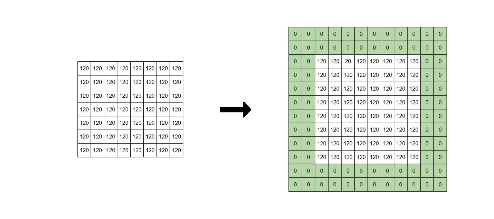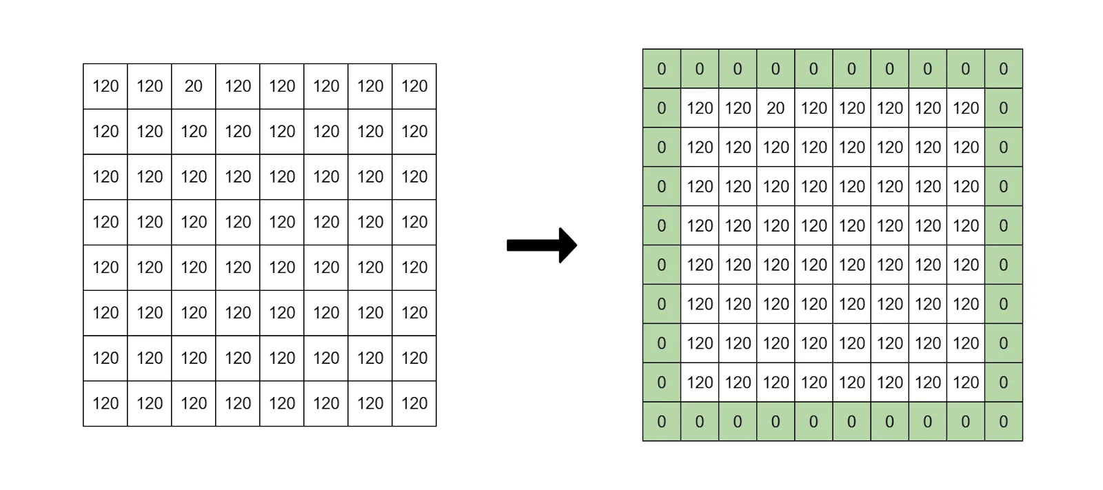 Let’s imagine you had an image of size 32x32 and applied the convolution with kernel 3x3. Then our output image has the dimensions of 30x30 because you had to ignore one line of pixels on every edge. To avoid that shrinkage of the dimension the padding concept comes into play.