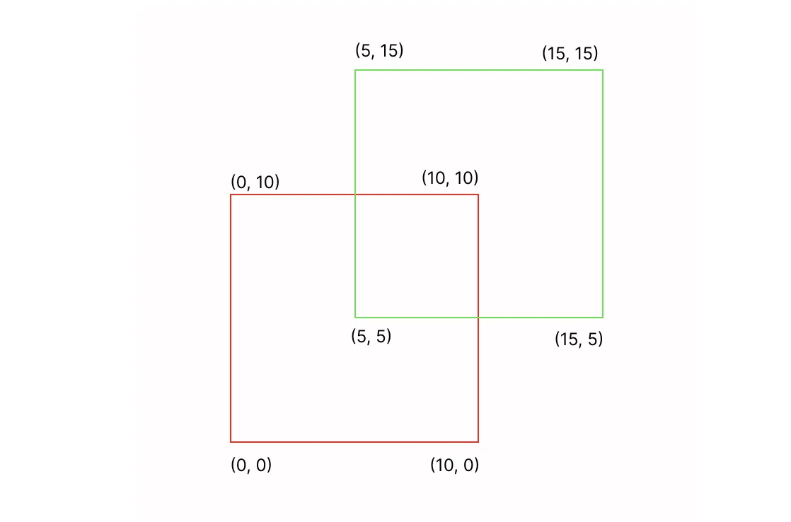- Area of Union: Area of the Red Bounding Box + Area of the Green Bounding Box - Area of Overlap = 10 10 + 10 10 - 25 = 175