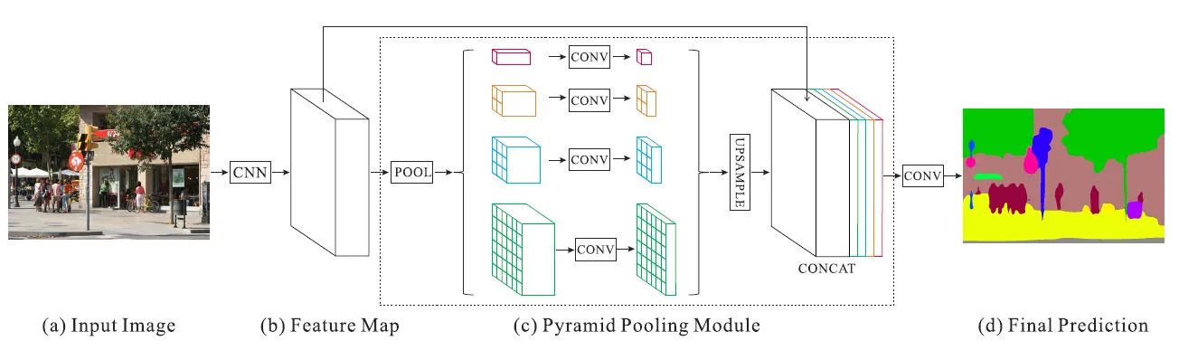 Given an input image, PSPNet uses a pre-trained ResNet model with the dilated network strategy to extract the feature map of the last convolutional layer. On top of this feature map, the pyramid pooling module is applied to harvest different sub-region representations. This is followed by upsampling on the pooled features to make them the same size as the original feature map. Afterward, these upsampled maps are concatenated with the original feature map to be passed to the decoder carrying both local and global context information which is fed into a convolution layer to get the final per-pixel prediction.