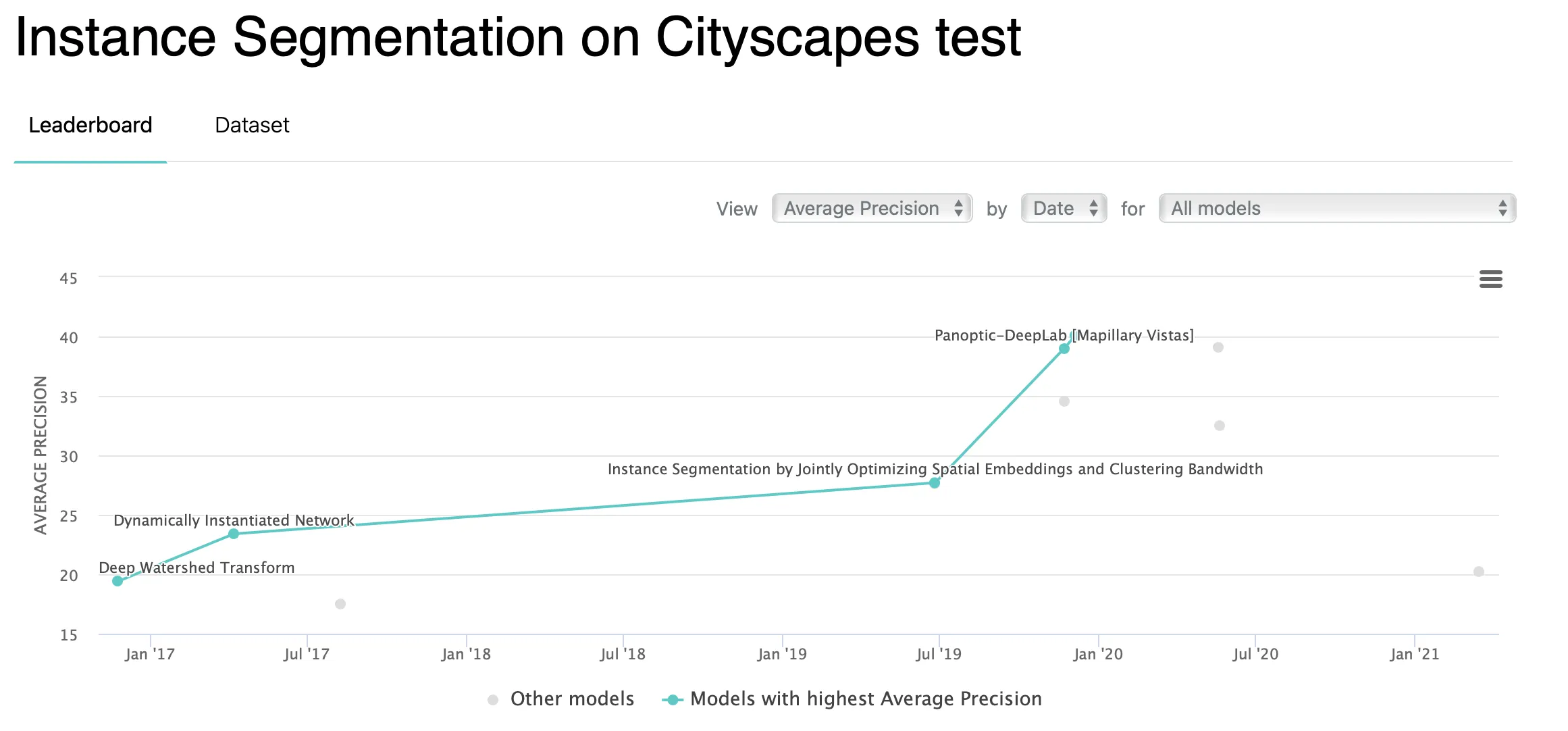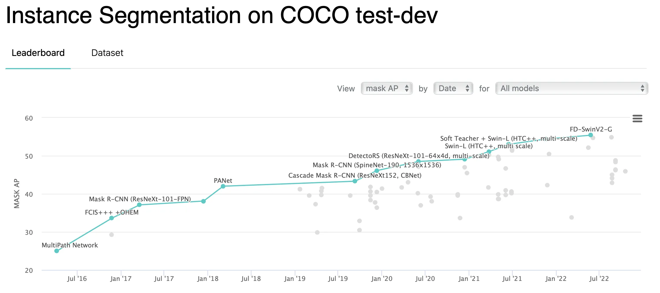 This means that there are many trustworthy benchmark datasets regularly used to evaluate recent Instance Segmentation model architectures and approaches. The most popular ones are: