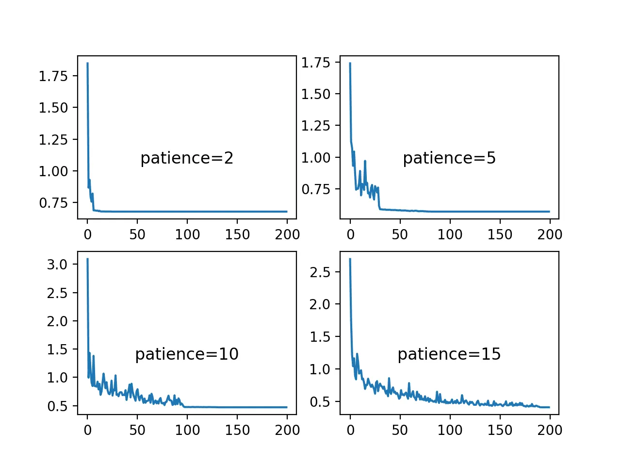 - Patience - the number of epochs with no improvement, after which the learning rate is reduced. If the patience is 10, the algorithm ignores the first 10 epochs with no improvement in the quantity and reduces the learning rate in the 11th epoch.
