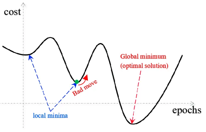 The most classical example of an optimizer is an algorithm called Gradient Descent (GD). It calculates the gradient (slope) of the loss function with respect to the weights and biases and updates them in the direction that minimizes the loss. The goal is to reach the global minimum (in comparison to local minima, as in the image below).