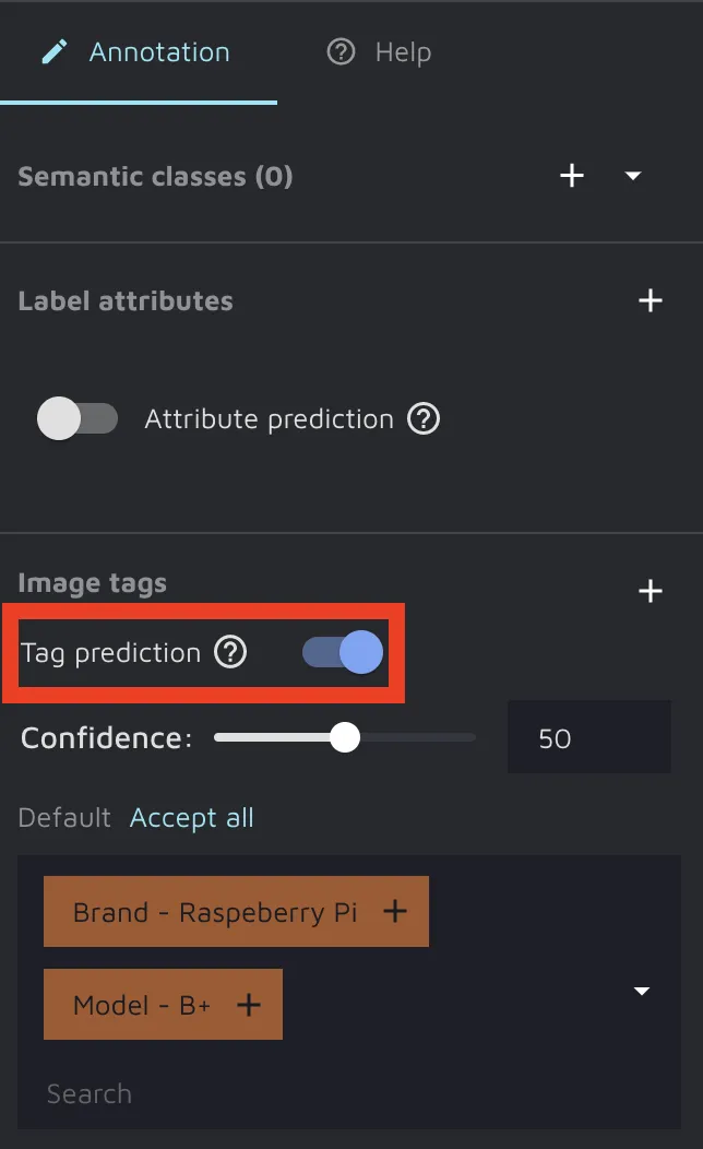 You can toggle the predictions on and off by pressing the toggle at the right panel of the Annotation Environment in the Image tags section.