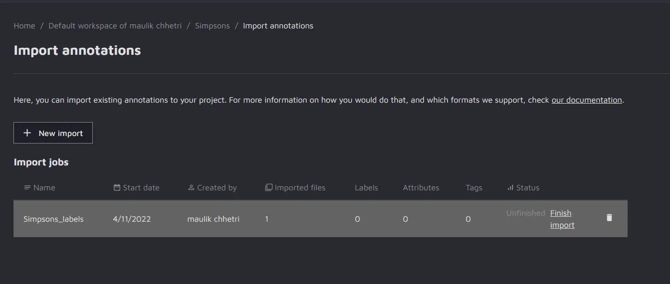 In our case, we named the import "Simpsons_labels". After the file is uploaded and checked, the import job will appear in the Import Jobs.