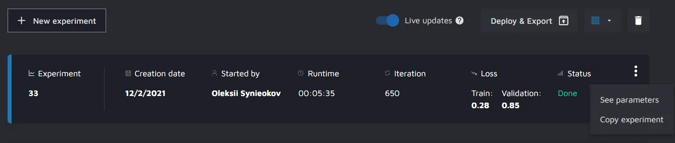 - See parameters - This will take the user inside the experiment section where the user can review the parameters used. (Read-only)