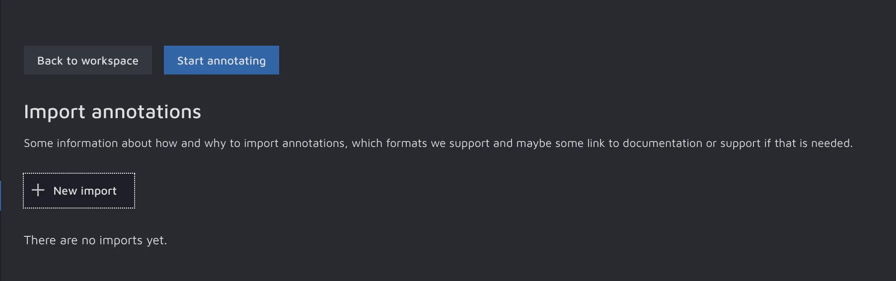 Here, you can upload annotations that you already have created in other annotation tools, or from other Hasty projects. To start, click the "New import" button. This will open the "Import" modal.