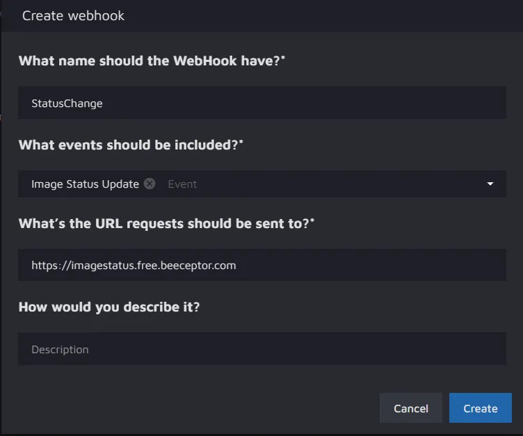 As mentioned earlier, you must register a URL to use the webhook. We used Beeceptor to create a URL. In this example, the name used to create an endpoint was "image status."